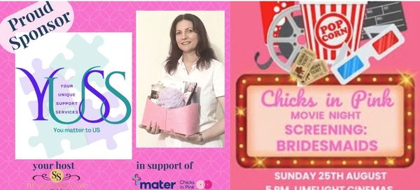 We are proud to be supporting another small business in our local area, The Skin Sanctuary at Brookwater. They are supporting Chicks in Pink by hosting a special screening of the movie Bridesmaids for the ultimate girls night out, with lots of raffle prizes to be won. The message of the event is "CHECK YOUR BOOBS" a great motto that we all need to remember and remind our loved ones about!!